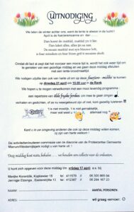 Gezellige middag met muziek, quiz. Afsluiting met lentebroodmaaltijd. Organisatie: activiteiten/ ouderen-team diaconie.
